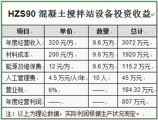 時(shí)產(chǎn)90方混凝土攪拌站成套設(shè)備具有良好的投資收益性,年產(chǎn)混凝土約19.2萬方(每天工作8個(gè)小時(shí),一年按300天工作日),按年銷量9.6萬方計(jì)算,約可獲利807萬元/年,詳細(xì)投資方案請(qǐng)咨詢鄭州長達(dá)專業(yè)投資顧問。
